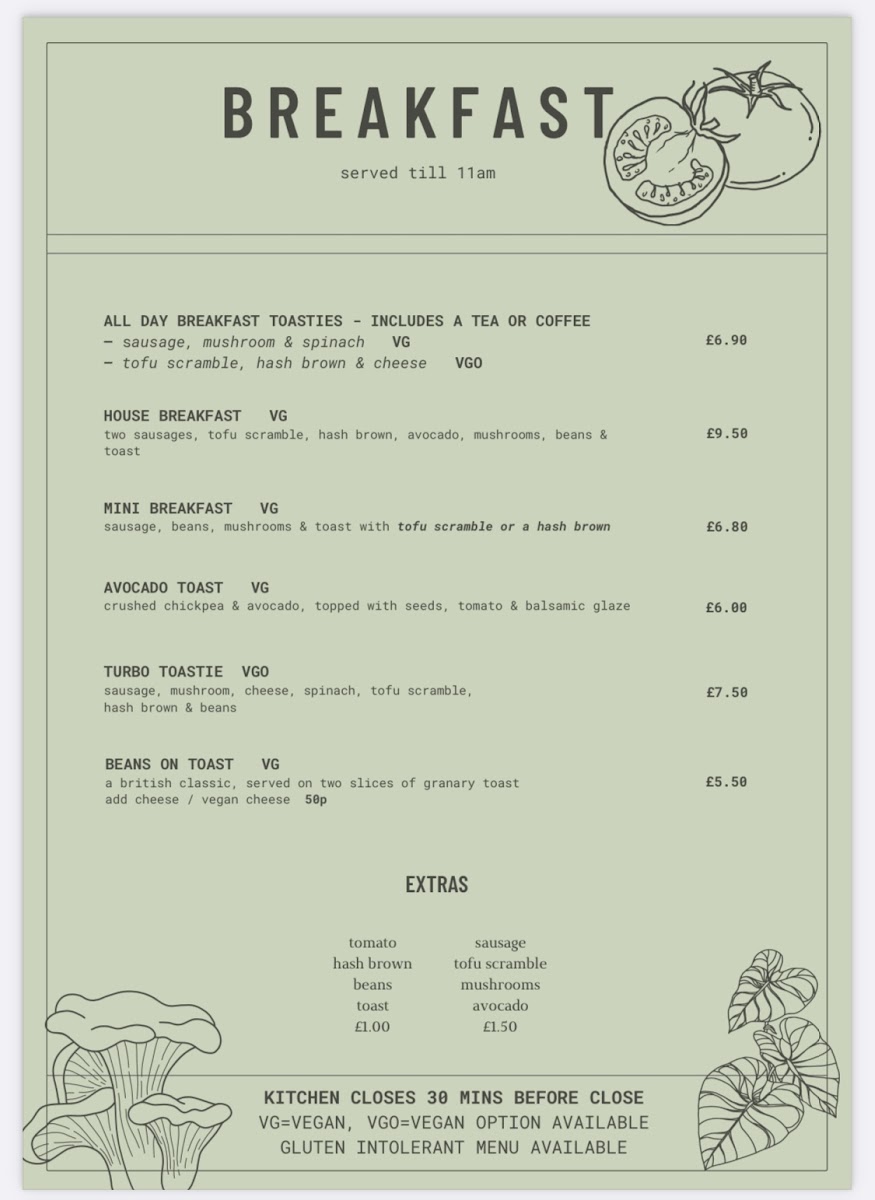 Start your day right with the House Breakfast (£9.50) or enjoy the lighter Mini Breakfast (£6.80). For a fresh twist, try the Avocado Toast (£6.00) or indulge in the delightful Turbo Toastie (£7.50). Each bite is crafted with care, making breakfast a celebration of taste.